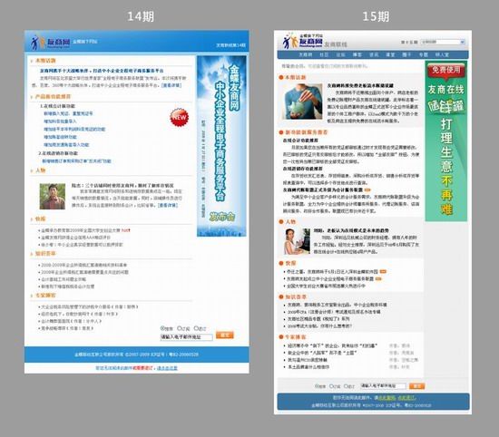 其實(shí)友商聯(lián)線15期和14期,在風(fēng)格設(shè)計(jì)上是近似的,都是商務(wù)風(fēng)格,簡潔大方,藍(lán)色調(diào)子,右邊為廣告區(qū)域。視覺設(shè)計(jì)并沒有新的改觀和體驗(yàn)。