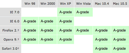 本框架代碼適用于所有由yahoo評為A級(A-grade)的瀏覽器。本文發文時間,yahoo對瀏覽器的評定情況如下圖所示。