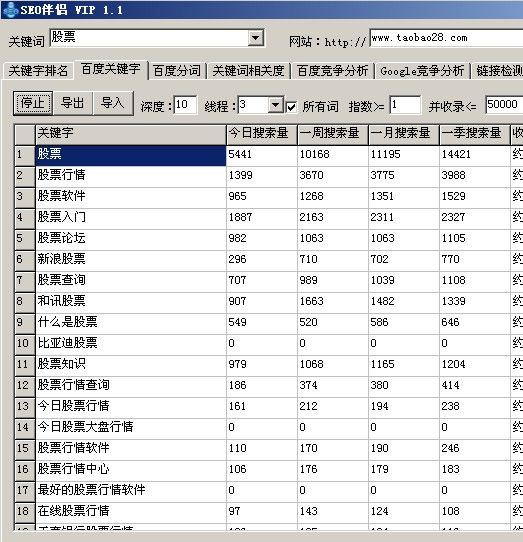 以前百度會提供相關搜索更多頁面,但是后來被百度關閉了,只有競價用戶才能看到,這部門關鍵字數據是非常有用的,之后便產生了很多的關鍵字選取軟件,軟件的數據來源是百度指數,也就是原先的相關搜索,比如最常見的有SEO伴侶,SEO助手(這兩款都是付費軟件)免費的也可以用,但是出來的關鍵字很少,而且可能還被禁止導出,SEO伴侶我一直在用,價格一年也就幾十元,我記得好像是35元!SEO助手價格相對比較貴,但是里面除了這個功能外,其他功能還有很多,還有最新的一個網站叫追詞網(http://www.zhuici.com/ )這個網站不需要給錢,但是需要用一個PR=3的鏈接換取VIP會員級別,有資源的可以去用一下!下面我以SEO伴侶為示范,找出“股票”相關的關鍵字~~